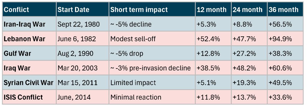 2. The long-term record is strong: Across nearly every major Middle East conflict in modern market history, investors who stayed invested were better off 12, 24, and 36 months later.