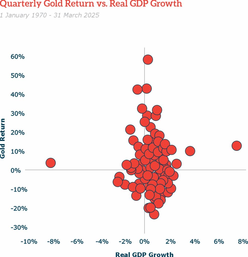 Plotting quarterly gold spot price returns against US gross domestic product changes reveals little relation between the two. Whether gold was up or down doesn’t appear connected to what was happening in the economy. Gold did gain in value during the 17 of the 28 quarters with negative GDP growth, but so did US government bonds.1 So, an investor with high-quality fixed income in their portfolio likely already has a measure of protection against economic contractions.